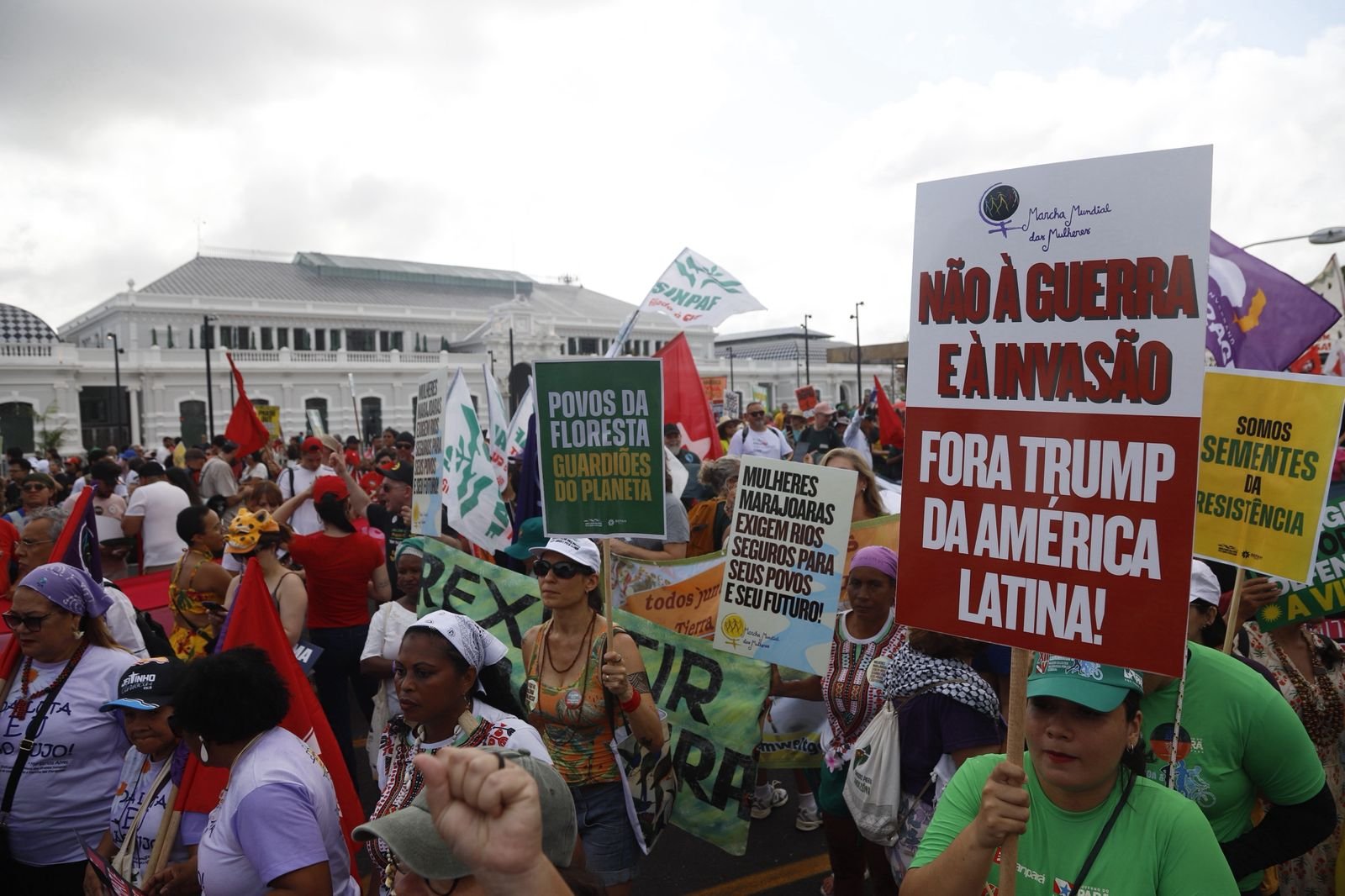 Sob um sol de 30 °C, milhares de pessoas se aglomeraram em frente ao Mercado de São Brás, acompanhando um trio elétrico e pedindo que o presidente dos Estados Unidos, Donald Trump, “não mexa com o Brasil” ou reivindicando “justiça climática”.