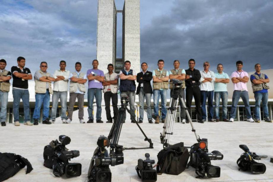 Cinegrafista da TV Bandeirantes, Santiago Andrade fazia cobertura das manifestações contra o aumento das tarifas de ônibus no Rio de Janeiro quando foi atingido por um rojão em 6 de fevereiro deste ano. Ele faleceu em 10 de fevereiro. Na foto, um grupo de profissionais da imprensa homenageou o colega em frente ao Congresso Nacional.