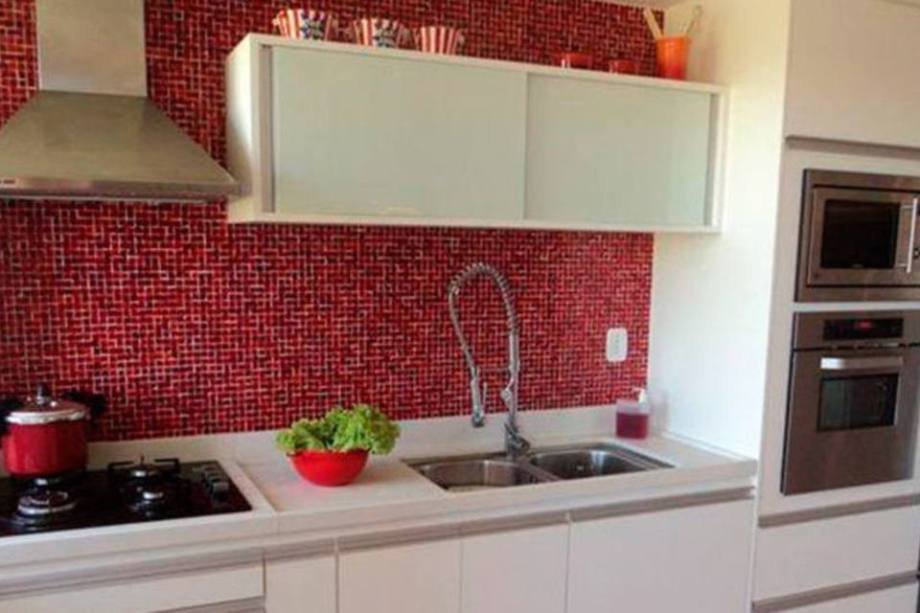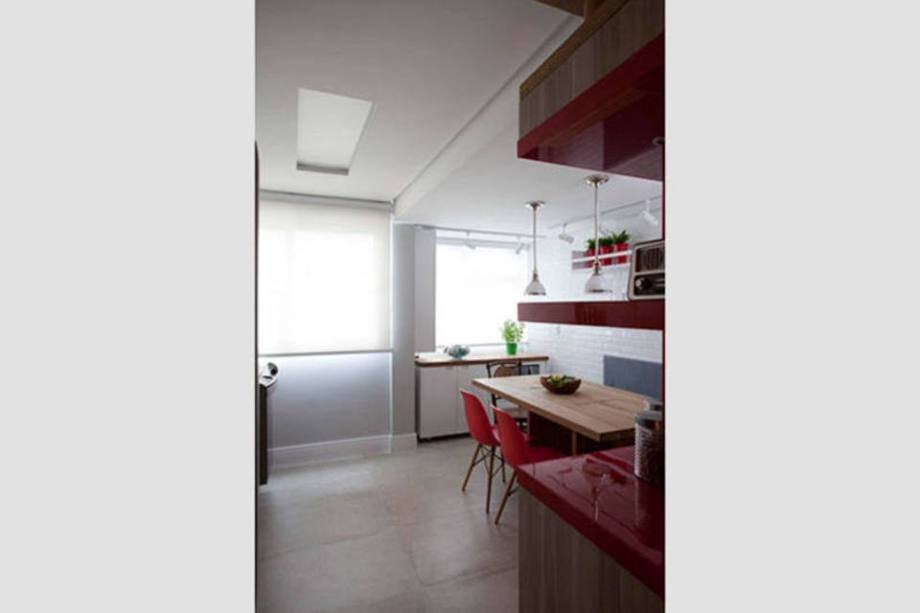 Cadeiras e bancada vermelhas são puro charme neste projeto da Juliana Pippi.