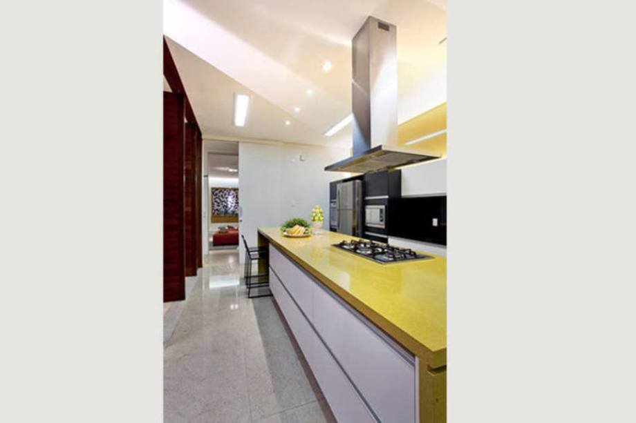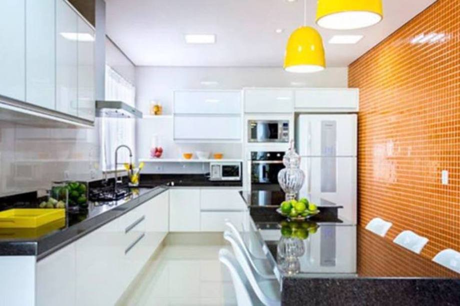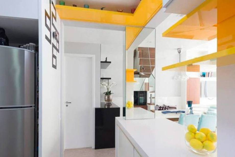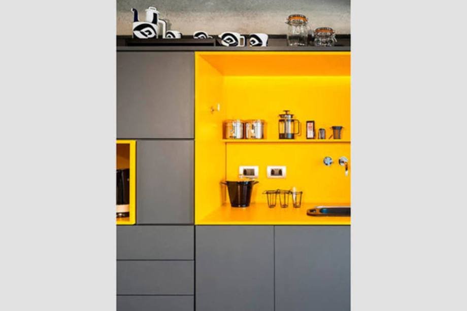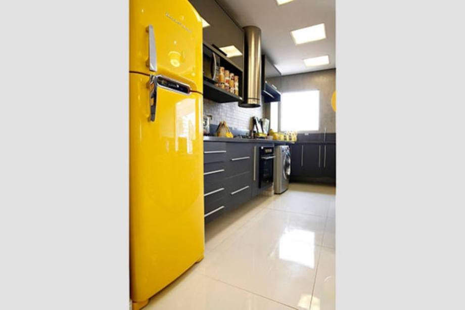 Neste projeto, alguns detalhes em amarelo nos armários desta cozinham trazem alegria ao ambiente.