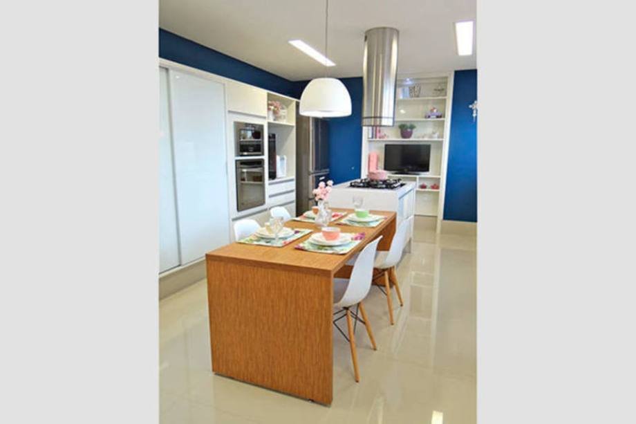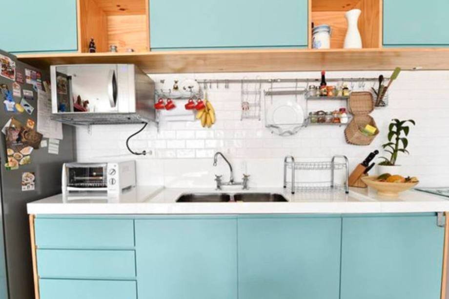Para quem não é muito fã de cores fortes, neste projeto o azul mais claro nos armários dá graça à cozinha.