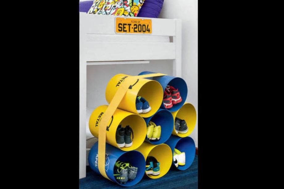 Inspirada na estante Oto100, esse projeto de DIY da nossa repórter visual Juliana Hamacek serviu para guardar os sapatos de seus filhos de forma única. Oito contêineres de cores vivas amarrados suportam vários pares e deixam o quarto dos pequenos super diferente!