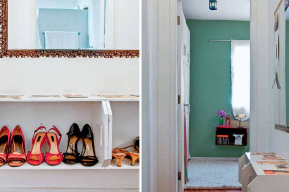Esse corredor foi transformado pela arquiteta Ana Flávia Del Fabbro. Entre eles, dois caixotes de feira lixados e pintados de tinta esmalte brilhante branca. Os sapatos ficam super charmosos expostos ali, a 30 cm do piso.