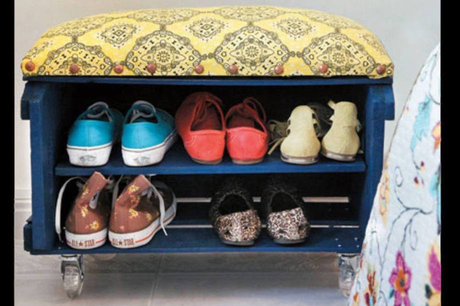 Feito com um caixote de feira, esse banco é ideal para guardas os sapatos. Na hora de sair, é só sentar nele para, então, calçar os pares. Mais prático, impossível!