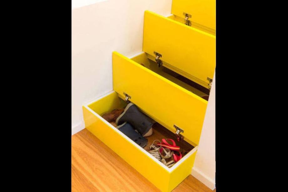 A escada amarela já saiu em nosso site e é um ótimo exemplo de como espaços inusitados podem se tornar trunfos no armazenamento de pertences. Além de ser linda e vibrante, seus degraus guardam os sapatos da família inteira.