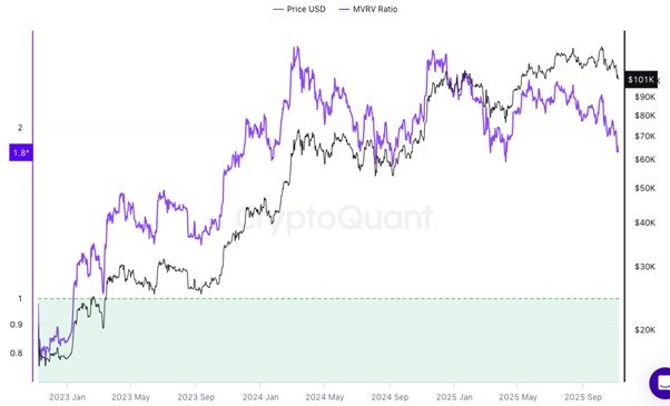 Como observaram essa semana analistas da XWIN Research Japan, o índice MVRV do bitcoin (gráfico abaixo do CryptoQuant) atingiu 1,8 (destacado no eixo vertical à esquerda), menor patamar desde abril de 2025. O movimento sugere que o valor de mercado está se alinhando com o custo médio de aquisição dos investidores, uma leitura compatível com zonas de acumulação.