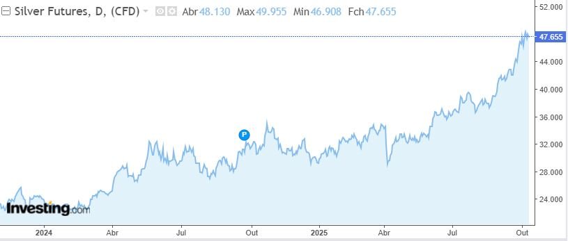 Valores da onça da prata desde janeiro de 2024. Metal alcançou máxima de quase US$ 50 nesta quinta-feira, 9 (Investing.com/Reprodução)