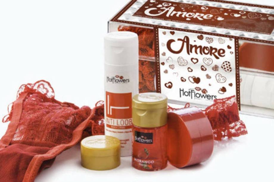 Hot Flowers. O conjunto traz calcinha vermelha, um gel aromatizante de morango, um gel umectante Inti-Loob Desejo, um creme Oriental e um creme Delirium. O preço do conjunto é 56,99 reais (ou 48,44 reais à vista).