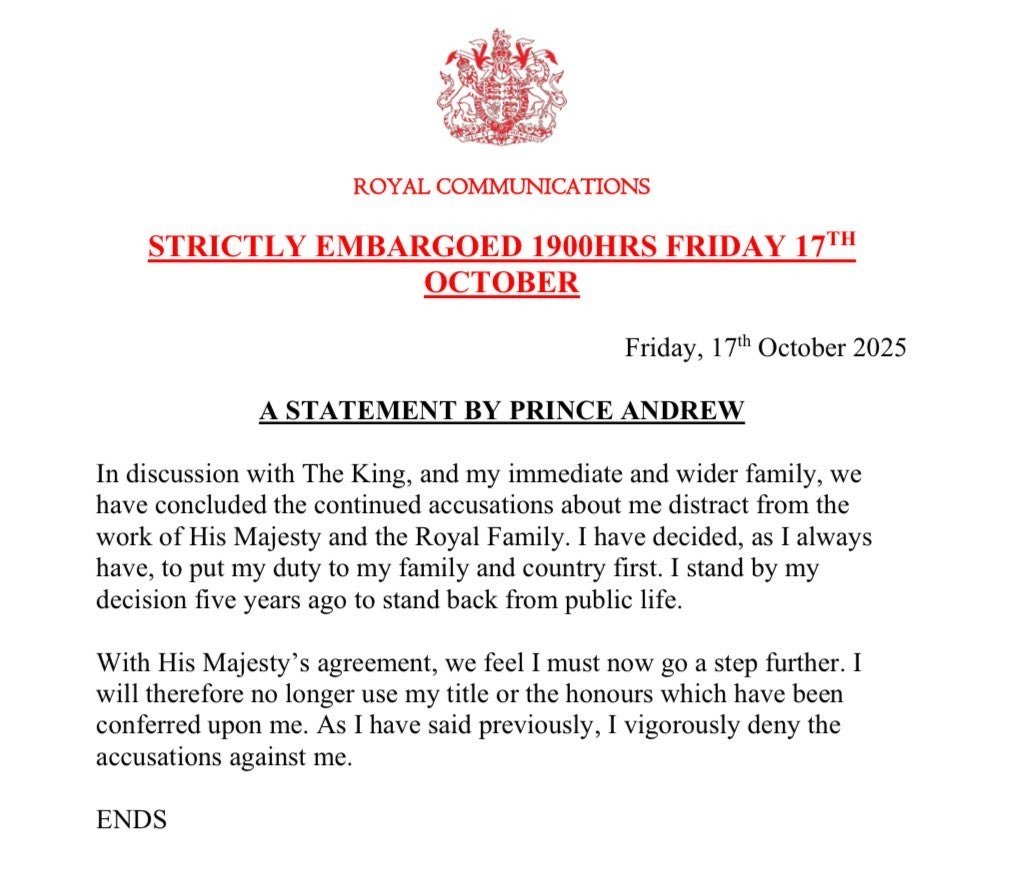 "Não usarei mais meu título nem as honrarias que me foram concedidas", declarou o filho da falecida rainha Elizabeth II em um comunicado, acrescentando que, embora negue todas as acusações, "as constantes alegações contra mim afetam o trabalho de Sua Majestade e da Família Real".