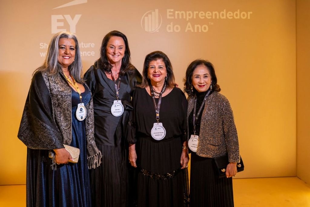 28ª edição do Programa EY Empreendedor do Ano Brasil: Natália Inês Costa, da CENSA, Sônia Hess de Souza, vice-presidente do Grupo Mulheres do Brasil; Luiza Helena Trajano, presidente do conselho de administração do Magalu; e Chieko Aoki, fundadora e presidente da rede Blue Tree Hotels (EY/Divulgação)