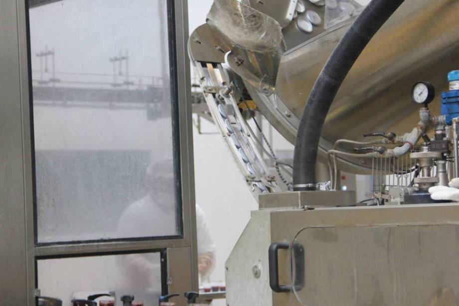 Outra medida para evitar contaminações e aumentar a vida útil do alimento, a tampa passa por um trilho que a submete a altas temperaturas. Na foto, é possível ver as tampas sendo despejadas na máquina. Elas irão para um carrossel aquecido antes de serem rosqueadas na embalagem.