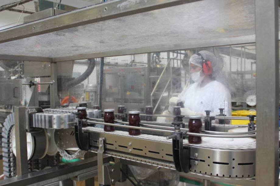 A geleia ainda está quente quando chega ao processo de envase. Isso ajuda a evitar contaminações, uma vez que irá se formar um pequeno vácuo no frasco quando o produto esfriar. Dessa forma, a empresa consegue produzir essa versão sem conservantes. Aqui, a geleia é inserida nos vidros em grande velocidade.