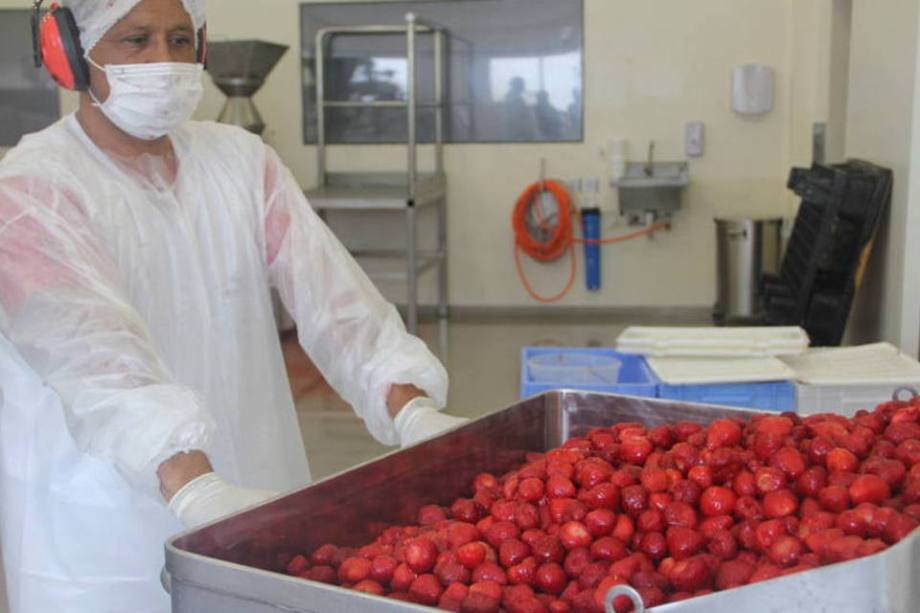 Os morangos selecionados são pesados e despejados em um grande carrinho, com capacidade para até 200 quilos.