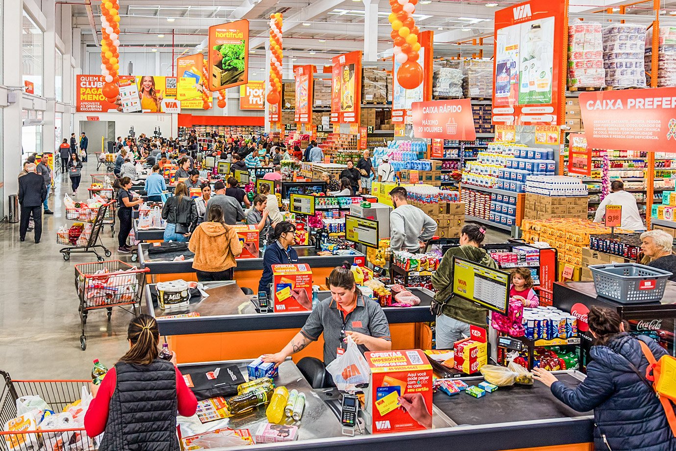 Com a bandeira Via Atacadista, o grupo aposta em um modelo mais completo. As lojas oferecem até 10 mil itens e se destacam por incluir padaria, açougue, hortifrúti e atendimento especializado. “Enquanto grandes redes trabalham com cerca de 7,5 a 8 mil itens, nós oferecemos até 10 mil. Isso faz com que a loja seja capaz de atender bem todas as classes sociais”, afirma Alexandre Simioni.