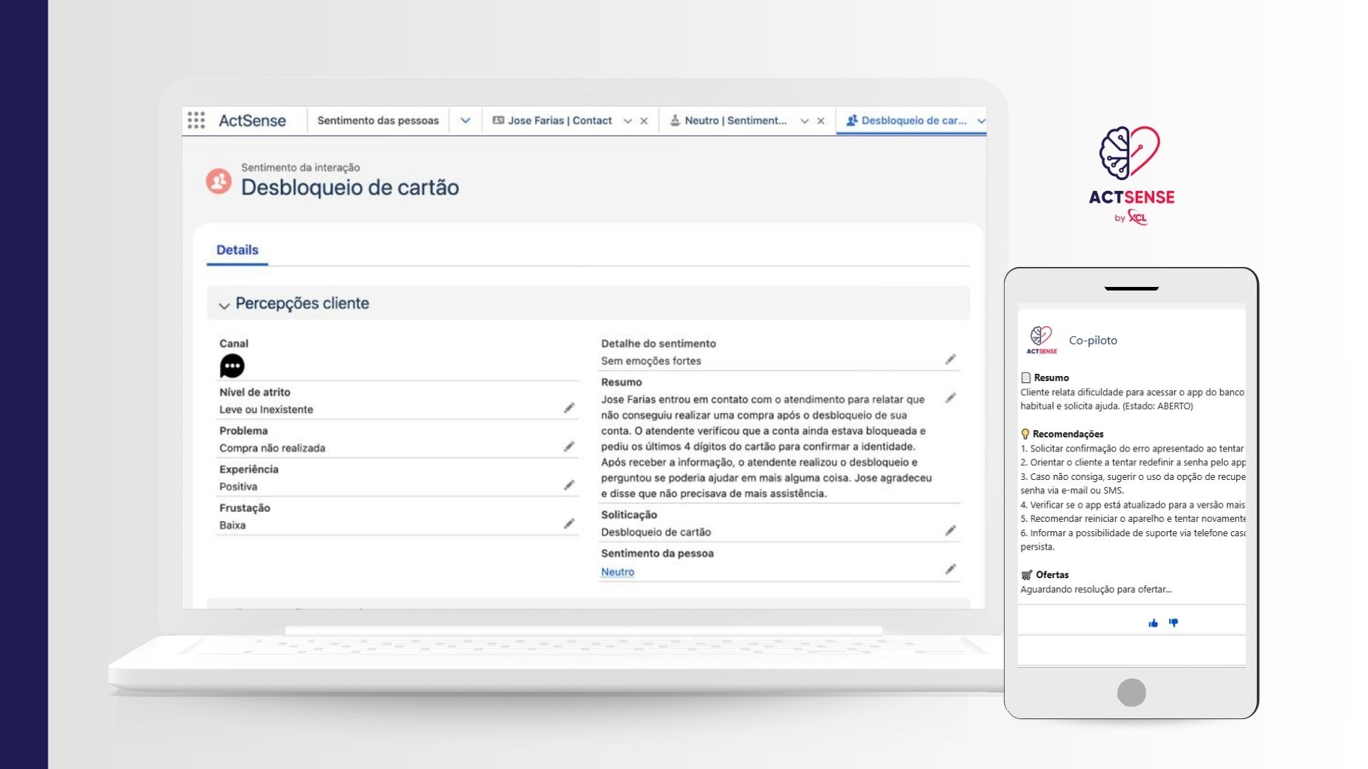 Na prática, o ActSense funciona como uma camada inteligente dentro das principais plataformas de CRM do mercado. Durante os atendimentos, monitora o tom da conversa e identifica alterações no humor do cliente. Quando uma insatisfação é detectada, pode-se acionar um time de retenção, interromper uma campanha ou sugerir uma nova abordagem para o atendente, além de sugerir ofertas personalizadas de acordo com o contexto da conversa.