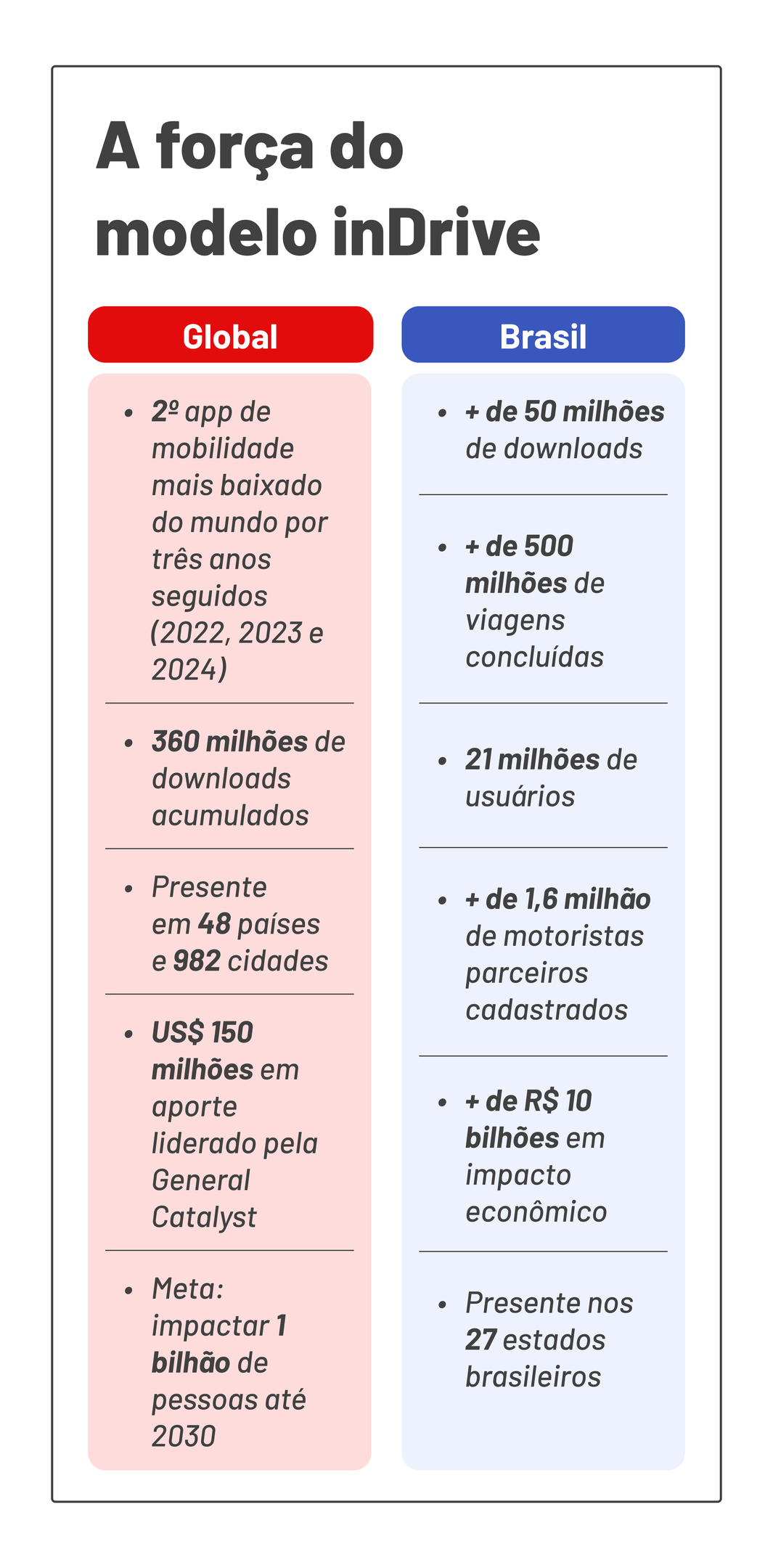 Se a proposta soa disruptiva, os resultados comprovam sua força. Globalmente, a inDrive é o segundo aplicativo de mobilidade mais baixado do mundo por três anos consecutivos (2022, 2023 e 2024), com 360 milhões de downloads em 48 países e 982 cidades.