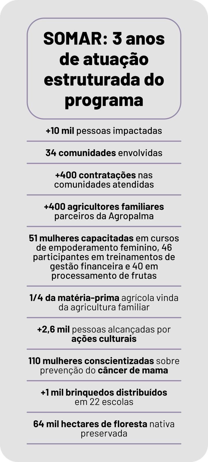 Essas populações são o foco do programa SOMAR, uma iniciativa de responsabilidade socioambiental, promovida pela Agropalma, que vem transformando a realidade da região, ao levar desenvolvimento humano, geração de renda e empoderamento comunitário.