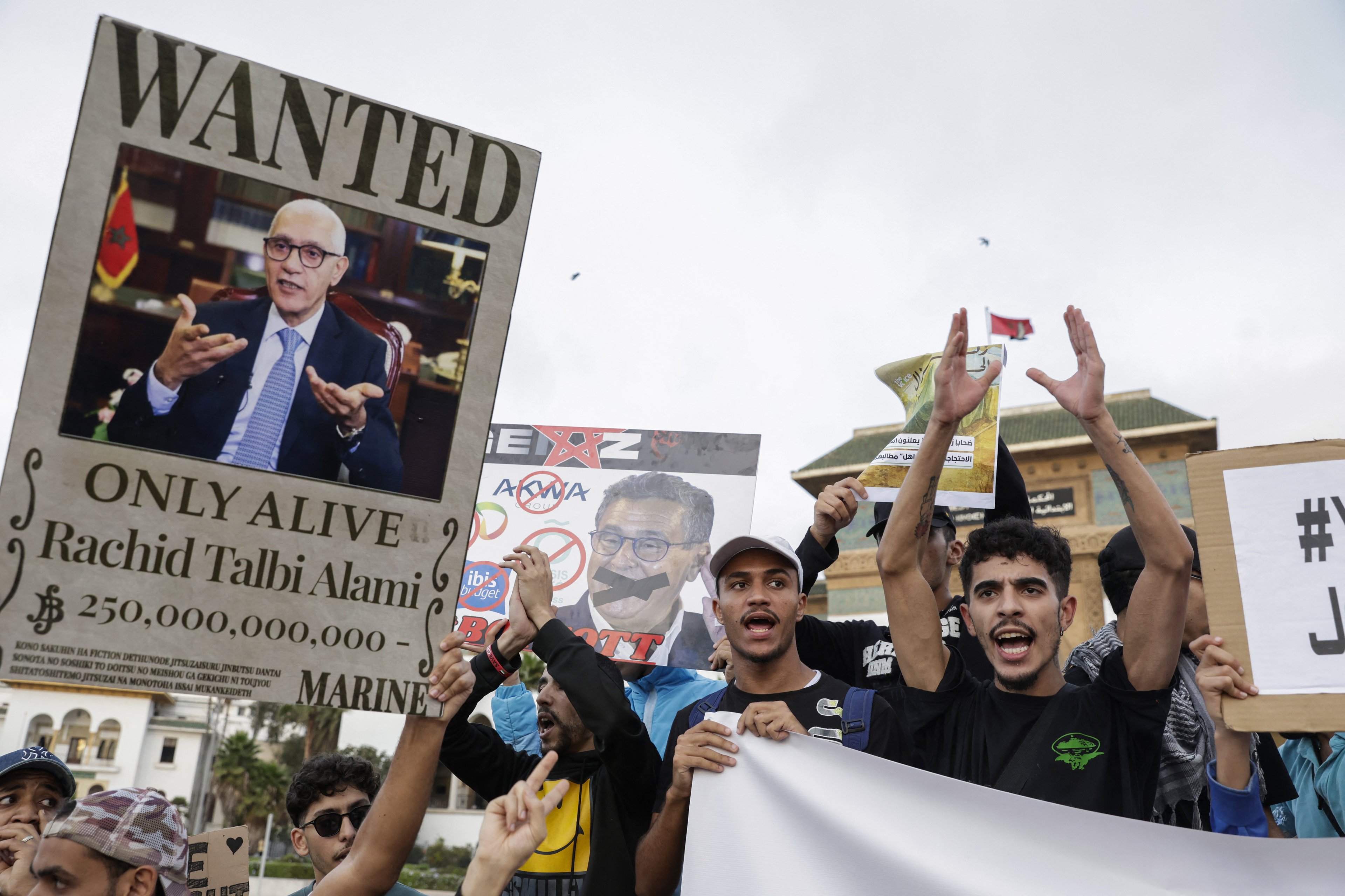 Manifestantes da Gen Z no Marrocos erguem cartaz do anime One Piece, com foto e recompensa para o político Rashid Talbi Alami