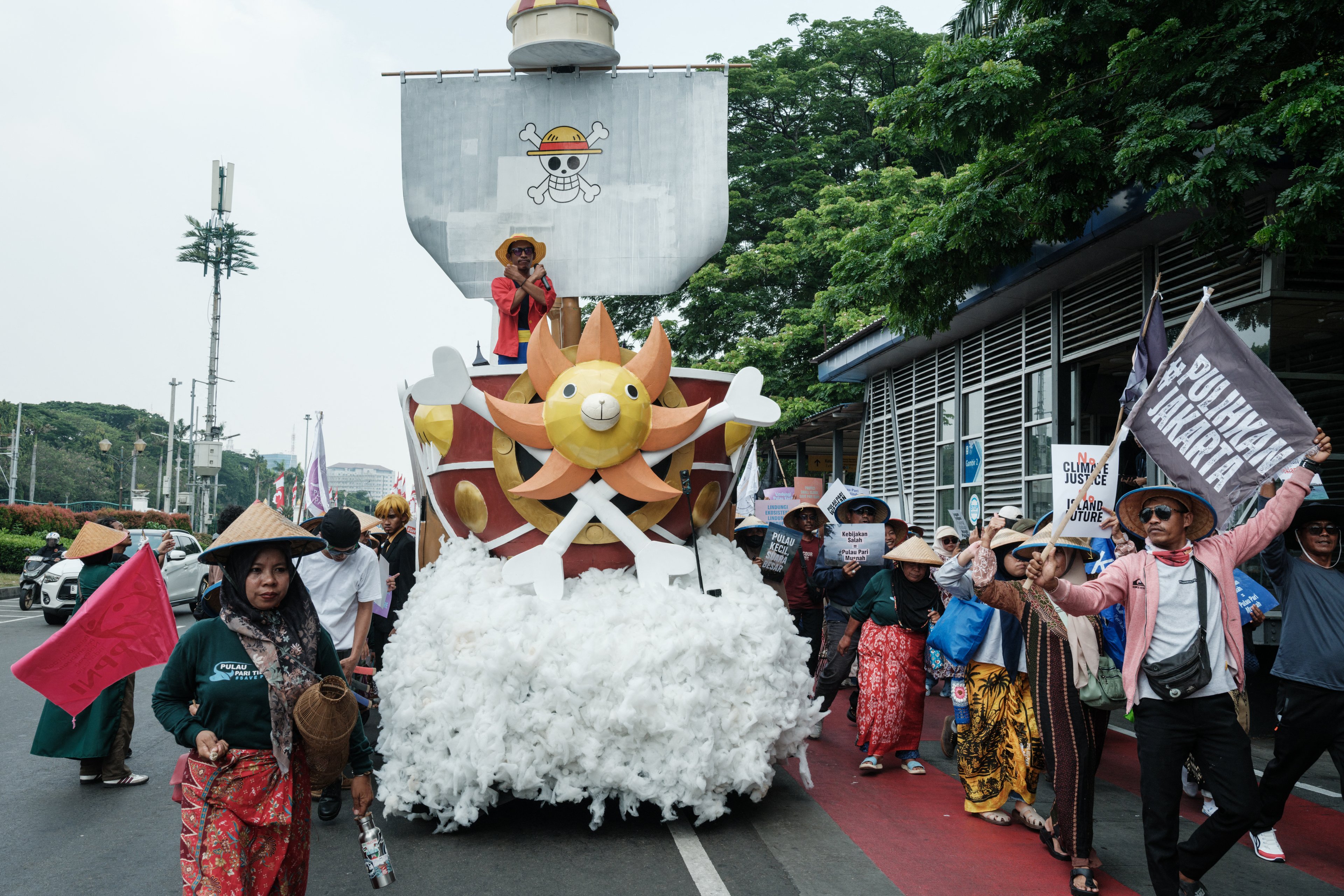 Manifestante protesta em barco do anime One Piece, durante as manifestações da Gen Z na Indonésia em outubro
