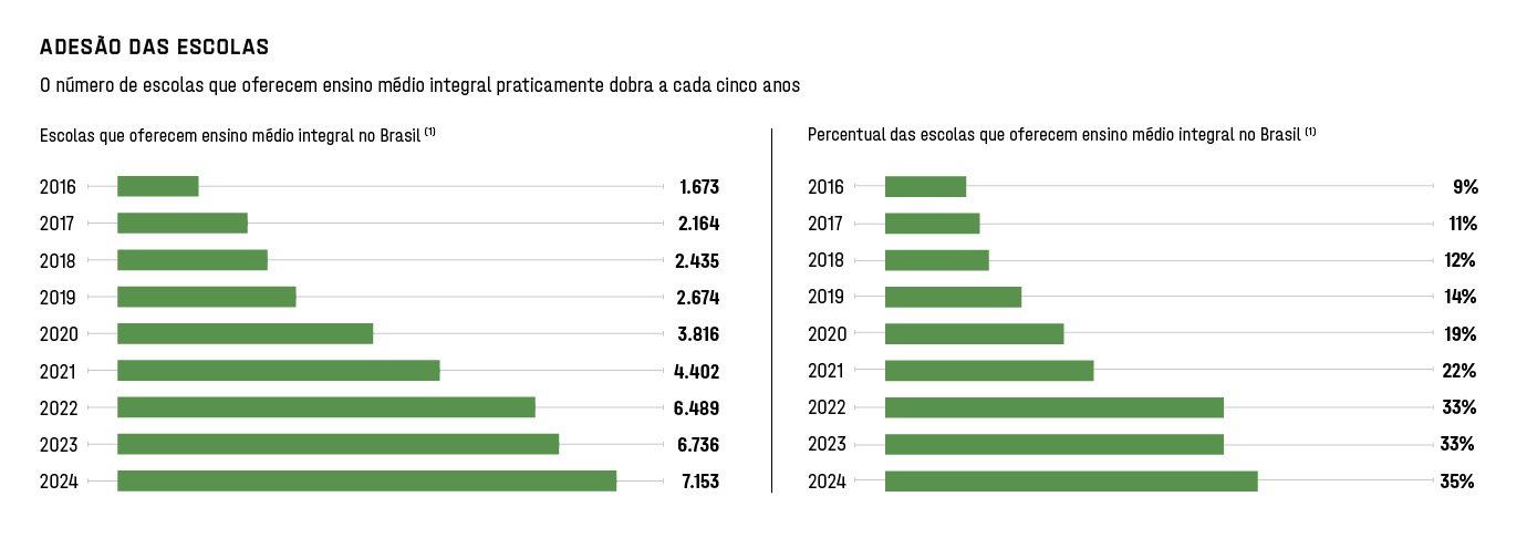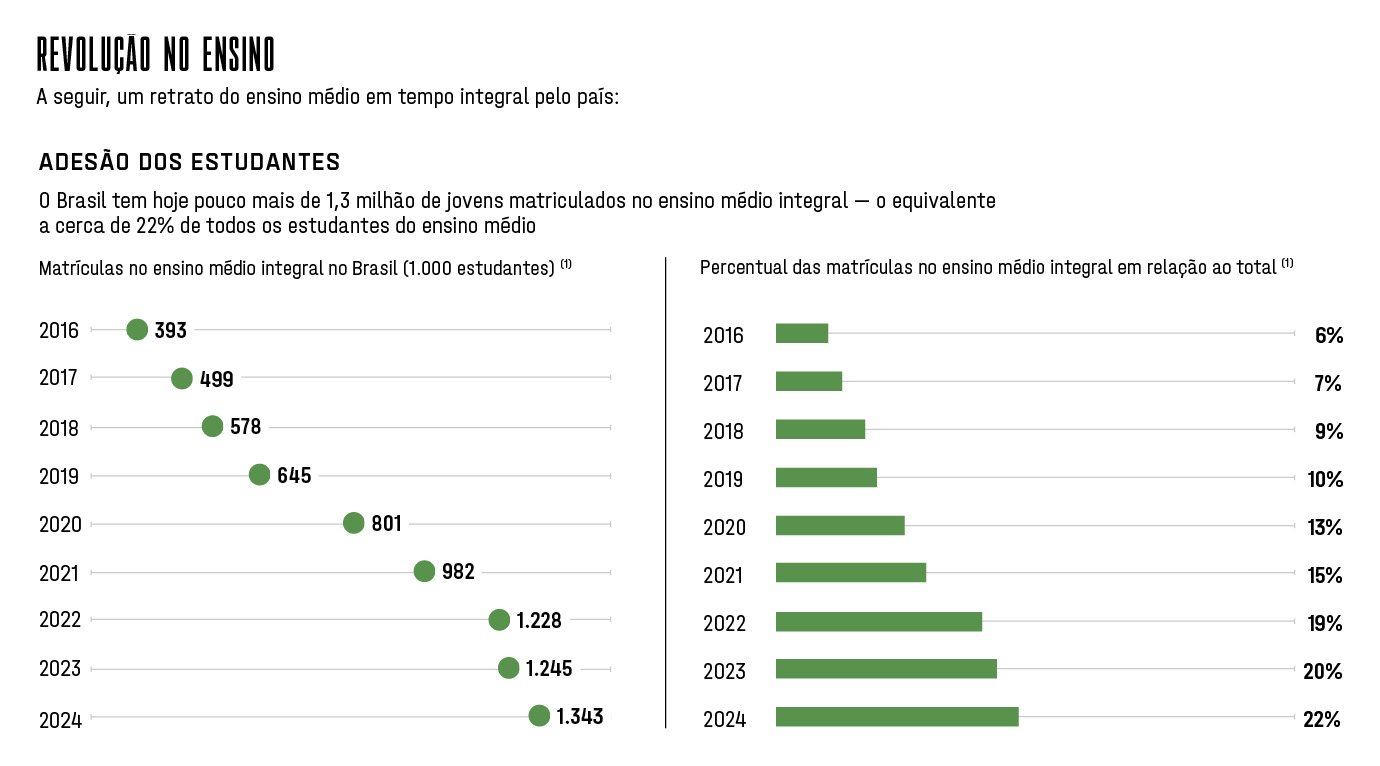 De lá para cá, essa proposta pedagógica, concebida por Antônio Carlos Gomes da Costa, Bruno Silveira e Thereza Barreto, se consolidou como a melhor alternativa para impulsionar os resultados nas redes públicas de ensino médio, sendo abraçada por gestores públicos de todo o país, independentemente da sua orientação política. A expansão continuou, apesar das trocas no comando nos estados. Em 2024, 7.153* escolas da rede pública ofereciam essa modalidade de ensino — um número que praticamente dobra a cada dois anos. Nelas estavam matriculados, no ano passado, 1,3 milhão de estudantes em todos os estados brasileiros, como mostram dados do Censo Escolar — quase quatro vezes mais do que em 2016.