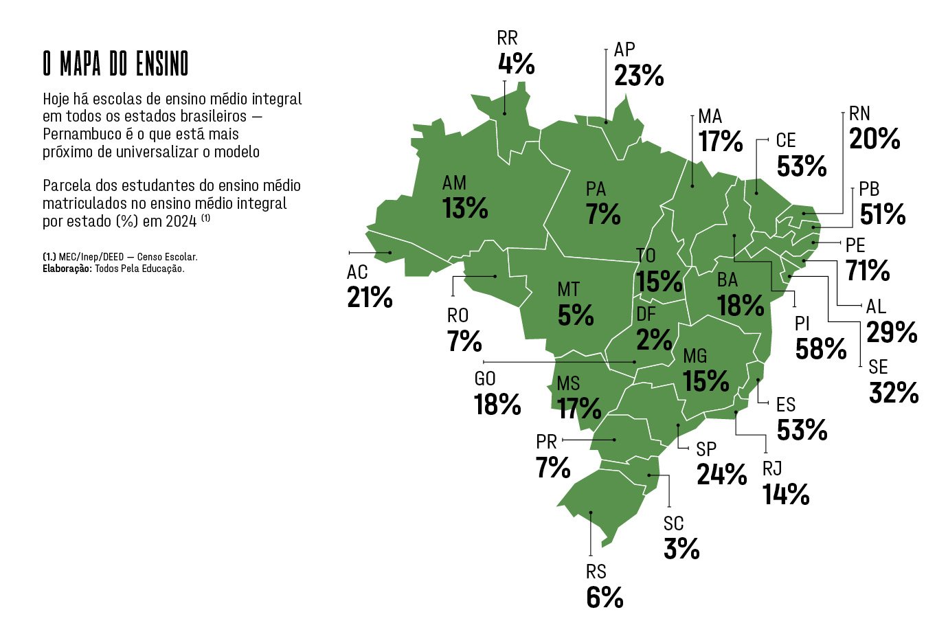 Os resultados alcançados ao longo dos últimos anos fazem com que todos os estados brasileiros já ofertem o ensino médio integral, refletindo o compromisso coletivo com a ampliação dessa política educacional. Em todo o país, governos estaduais têm investido na expansão do modelo, reconhecendo seus impactos positivos na formação dos estudantes. Dados de 2024 demonstram que alguns estados já se aproximam da universalização, como Ceará (74%), Piauí (71%), Pernambuco (69%) e Paraíba (63%). Outros vêm registrando avanços expressivos desde 2016, quando partiram de uma base pequena e hoje já alcançam mais da metade da rede com oferta integral, casos da Bahia (54%), Espírito Santo (53%) e Mato Grosso do Sul (47%), segundo dados do Censo Escolar.