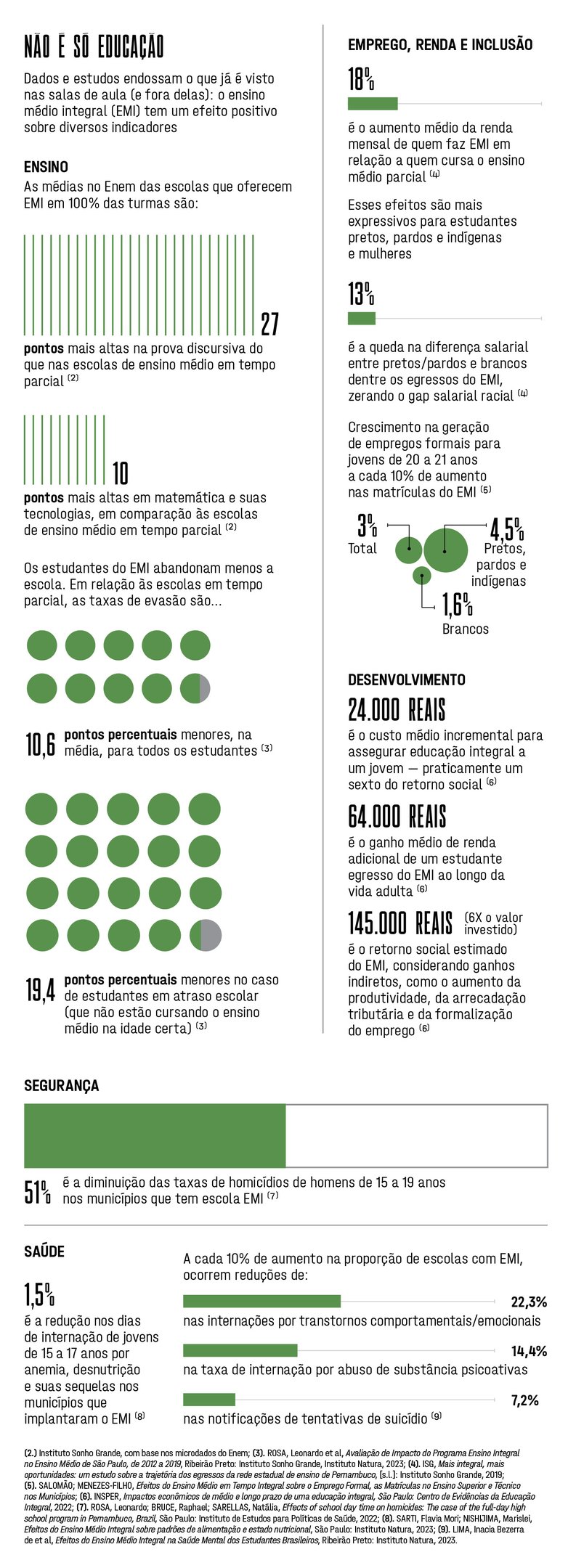 Do ponto de vista econômico, o ensino médio integral é um ótimo investimento de recursos públicos. Segundo um estudo realizado por pesquisadores do Insper, um estudante que cursou os três anos de ensino médio integral tem um ganho médio adicional de 64.000 reais na sua renda ao longo da vida adulta. São quase três vezes mais do que o custo incremental da política, que gira em torno de 24.000 reais por estudante. Quando se consideram os ganhos indiretos — como o aumento da produtividade, da arrecadação tributária e da formalização do mercado de trabalho — o retorno social pode chegar a 145. 000 reais por estudante.