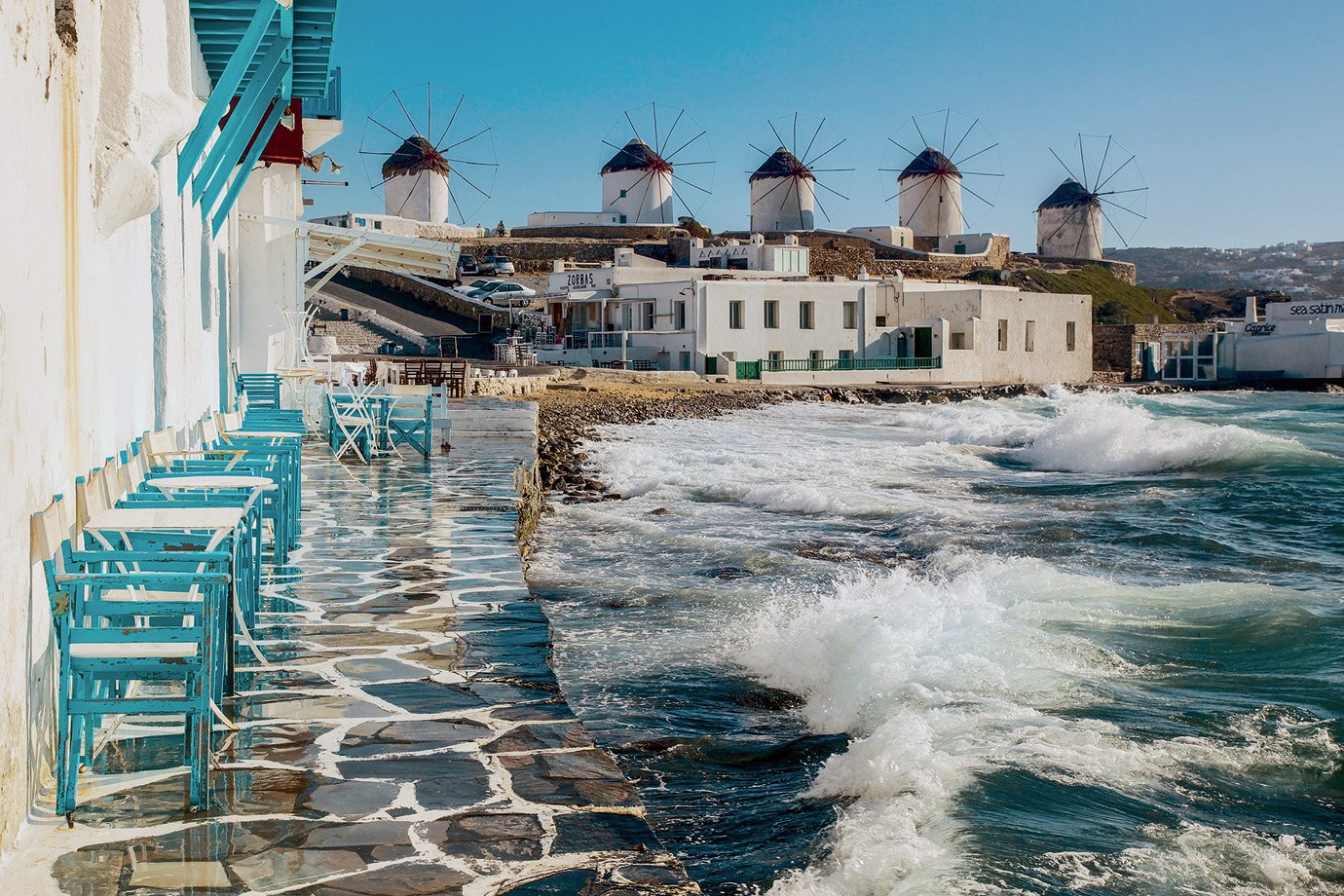 Além das festas e lojas de grife que fazem a fama da ilha, o destaque de Mykonos são as praias de areia dourada e águas transparentes. Ao longo da costa sul estão algumas das praias mais bonitas da ilha, como Psarou Beach, Platis Gialos, Paraga Beach, Paradise-Beach e Super Paradise Beach, onde é possível alugar espreguiçadeiras e guarda-sóis. Chora é o centrinho da cidade, com ruas estreitas e lotadas de lojas de souvenirs a grifes internacionais. Próximo ao centro estão os famosos moinhos da cidade, ponto de encontro no final do dia para ver o pôr do sol.