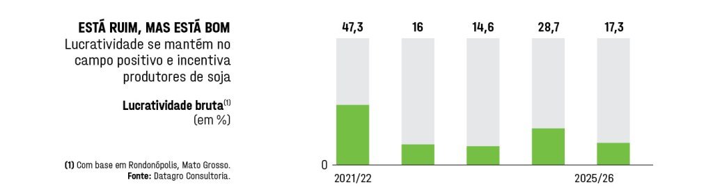 Mesmo recuando de 28% no ciclo anterior para 17% nesta safra, a lucratividade deve se manter positiva em relação a outras culturas — e até melhorar em algumas regiões do país.
