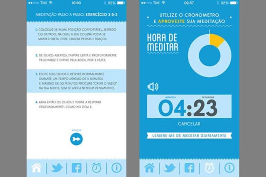Grátis, em português, para Android e iPhone O app da ONG Mãos Sem Fronteiras é uma espécie de cronômetro de meditação. Seu objetivo é estimular o usuário a praticar meditação durante cinco minutos por dia. O app marca o tempo e toca uma musiquinha supostamente relaxante. E é só. Fica para o usuário a tarefa (difícil para a maioria das pessoas) de esvaziar a mente e desligar-se das preocupações por alguns minutos.