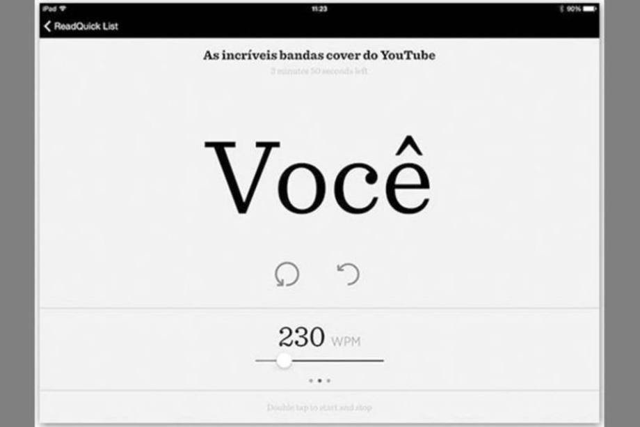 9,99 dólares, em português, para iPhone/iPad ReadQuick é um app de leitura dinâmica. Ele exibe o texto palavra por palavra, em alta velocidade. Segundo os autores, isso força o leitor a se concentrar em cada palavra, o que permite ler e entender o texto mais rapidamente. Ao testá-lo, achamos o método esquisito. No final, preferimos continuar lendo da maneira tradicional. Mas o ReadQuick tem seus fãs. Alguns dizem conseguir ler até 700 palavras por minuto, um ritmo alucinante. O ReadQuick funciona com textos disponível na web e em apps como Instapaper, Pocket e Readability.