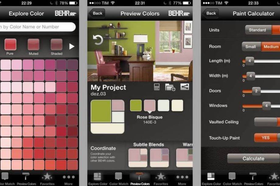 7/9  (EXAME.com) 	Grátis, em inglês, para  Android e  iPhone/iPad	Vai pintar a casa? O ColorSmart, da marca de tintas Behr, ajuda a combinar cores diferentes e também a visualizar como vai ficar uma cor na parede.	Para isso, basta escolher uma foto – de algum cômodo de casa ou escritório – entre as disponíveis no app e aplicar a cor desejada. O ColorSmart ainda inclui uma calculadora que ajuda a estimar quanta tinta será necessária para a pintura.