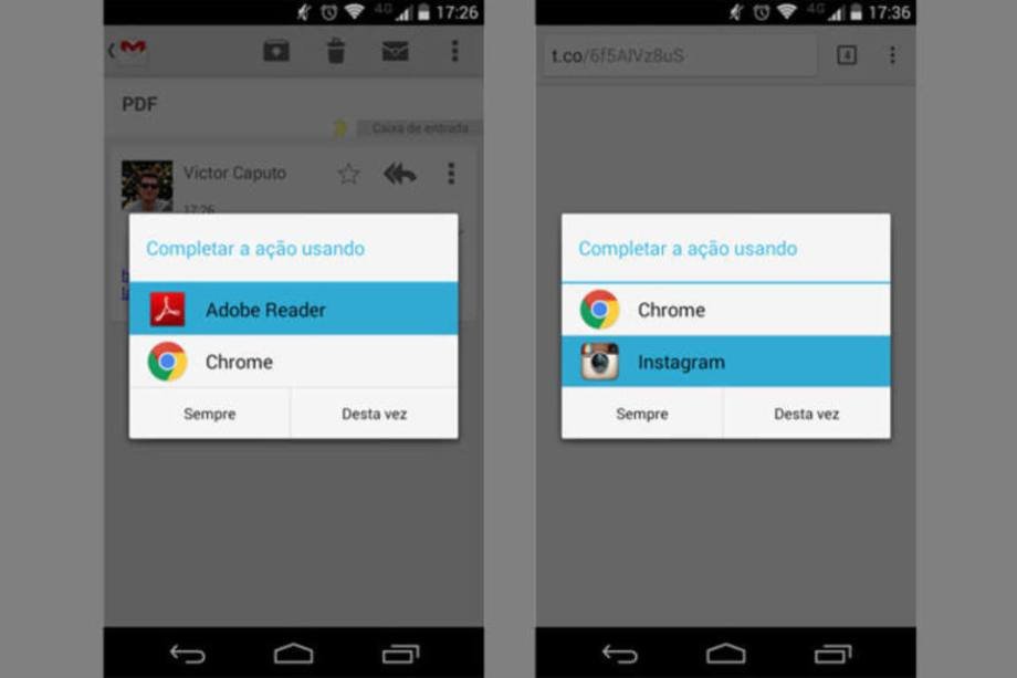 No Android é possível escolher um app padrão para abrir determinado tipo de arquivo. Ao tentar abrir um link de PDF, por exemplo, pode-se escolher entre o Chrome ou qualquer outro app capaz disso, como o Adobe Reader. O usuário pode escolher que o arquivo seja aberto somente uma vez naquele aplicativo ou que o sistema guarde aquela informação e use somente um programa para abrir aquele mesmo tipo de arquivo sempre.