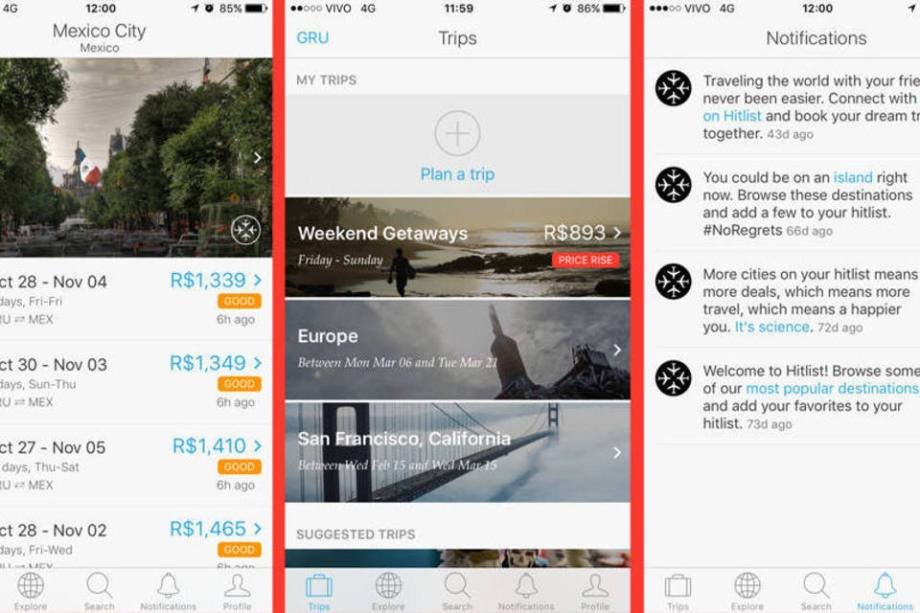 Grátis, em inglês, para iPhone Hitlist é um app para viagens com uma proposta diferente e bastante interessante. Ele não serve somente como um buscador de passagens e hotéis. Na verdade, ele tem roteiros sugeridos. Quer passar o Dia dos Mortos no México? Ele diz quanto vai custar. Quer viajar pela Europa? Ele sugere países e dá uma estimativa de transporte. Além de funcionalidades bacanas, ele ainda tem um belíssimo visual, com fotos que farão você ter vontade de conhecer qualquer lugar.