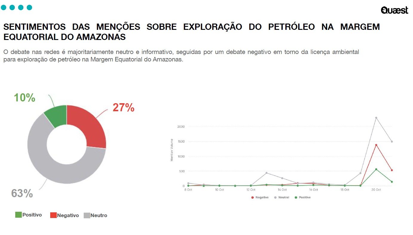 O levantamento mostra que antes da liberação, o debate nas redes era majoritariamente neutro e informativo. Após a autorização concedida pelo Ibama, o número de menções totais sobre licença ambiental e de reações negativas cresceu. Das menções, 63% são neutras, 27% são negativas e 10% positivas.