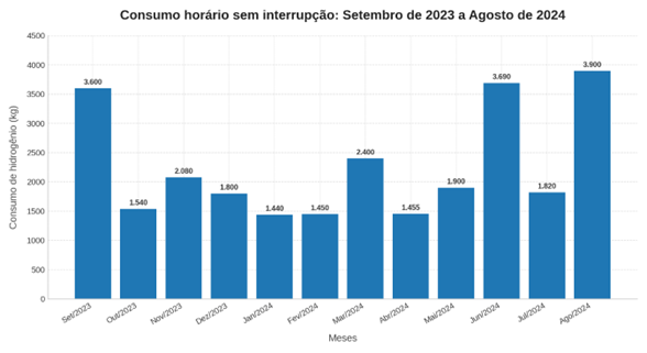 Um estudo recente analisou dados de vertimento eólico do ONS entre setembro de 2023 e agosto de 2024, período de alta incidência de curtailment devido a restrições na rede elétrica. O estudo avaliou a operação de uma planta de hidrogênio verde com armazenamento e integrada ao Sistema Interligado Nacional, utilizando exclusivamente essa energia excedente. Projeções indicam que a planta seria capaz de produzir de forma consistente pelo menos 1.440 kg de hidrogênio por hora. A figura abaixo apresenta a operação horária ininterrupta da planta ao longo do período analisado.