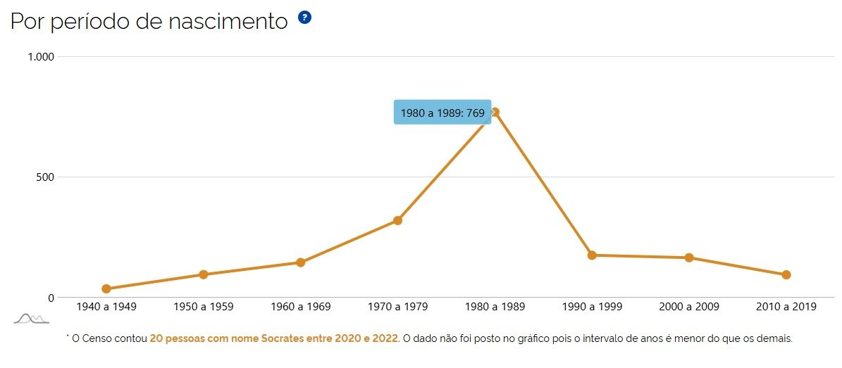 O nome Sócrates foi dado a 769 pessoas nascidas entre 1980 e 1989. Depois, caiu rapidamente em número de registros. No Censo de 2022, 1836 dos entrevistados carregavam o nome.