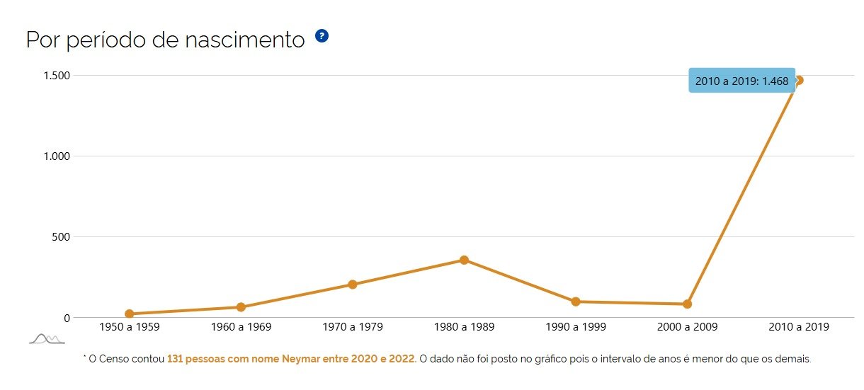 Apesar de nunca ter passado da semifinal em uma Copa do Mundo (mesmo que em 2014 não tenha disputado a partida de semi contra a Holanda, quando o Brasil perdeu por 3 a 0 logo após o trágico 7 a 1), Neymar inspirou o nome de 1468 bebês entre 2010 e 2019. Atualmente, 2443 brasileiros se chamam Neymar.