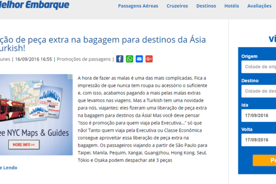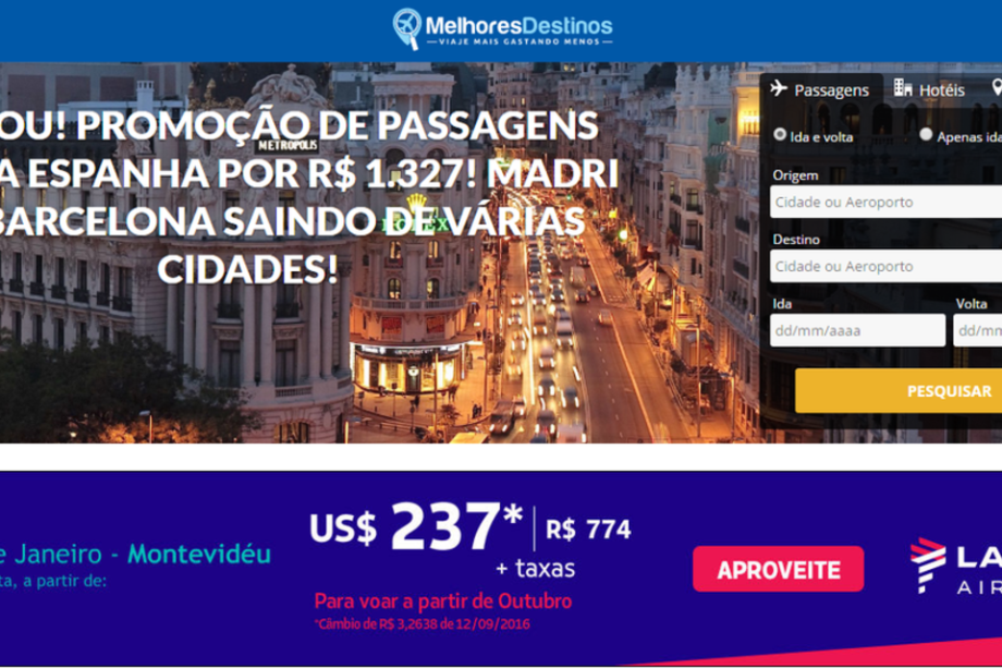 O site Melhores Destinos é especializado em dar dicas de promoções de passagens aéreas. Além de ser fonte de informação, o site também tem algumas ferramentas. O usuário pode cadastrar o e-mail ou baixar o aplicativo Melhores Destinos, disponível para sistemas Android e iOS, para receber alertas de promoção. O site ainda disponibiliza guias com informações sobre os destinos e indica os melhores cartões de crédito para acumular pontos e emitir passagens por milhas. Seus leitores ainda formam uma rede de avaliação das companhias aéreas.