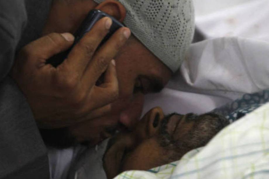 12. Parentes de membros da Irmandade Muçulmana e apoiadores de Mursi choram ao lado dos corpos em mesquita no Cairo, Egito