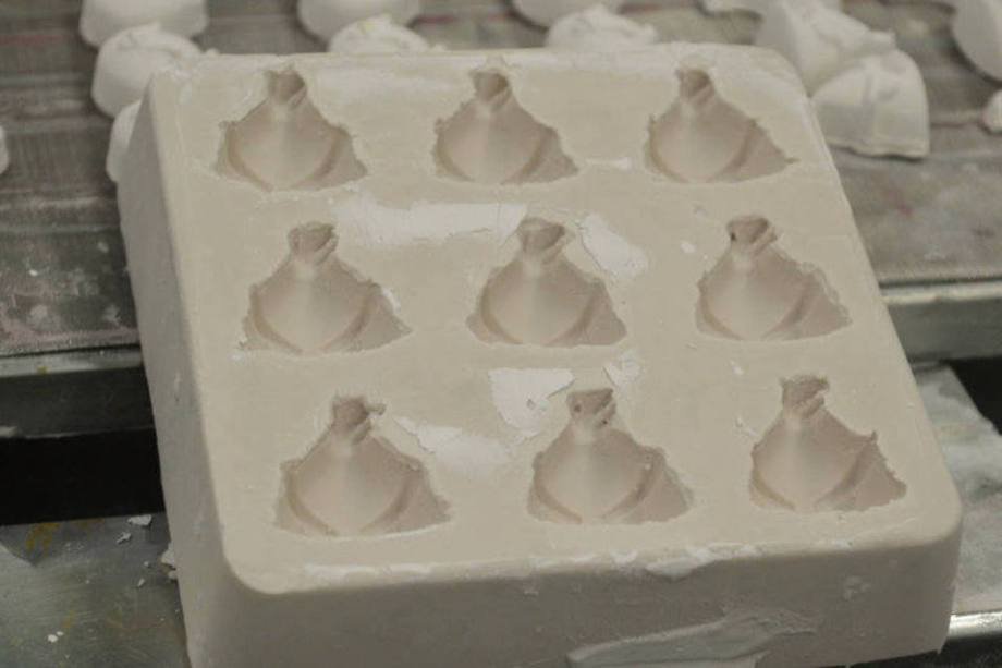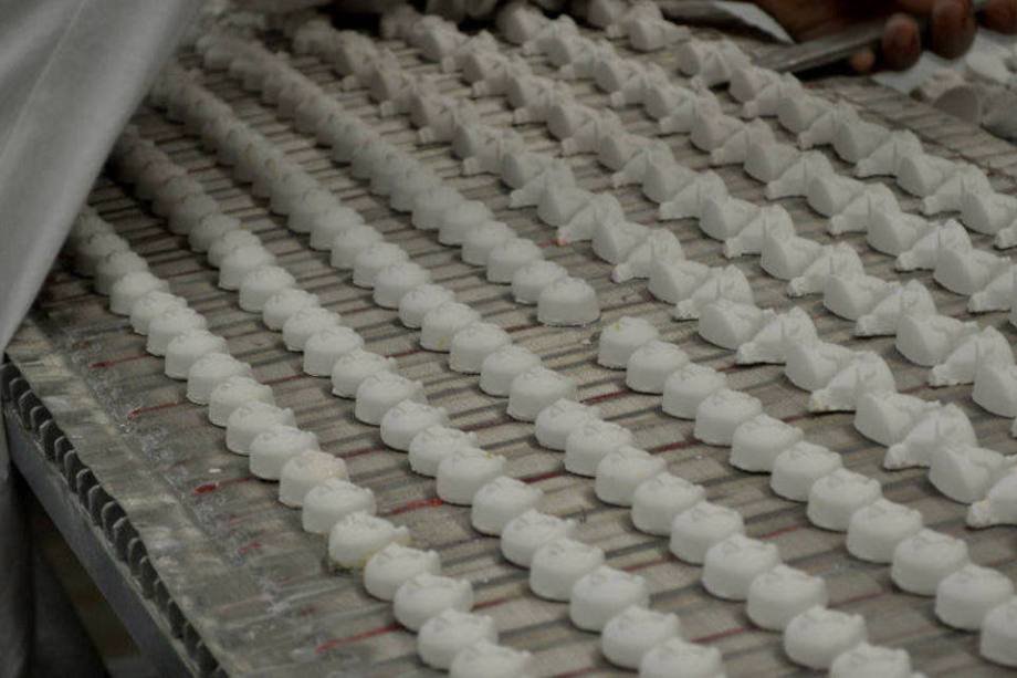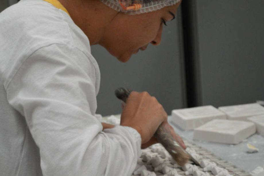 O gesso é colocado nessas fôrmas, que são produzidas apenas na fábrica da Espanha e trazidas para o Brasil. O material de que são feitos esses moldes também é segredo.