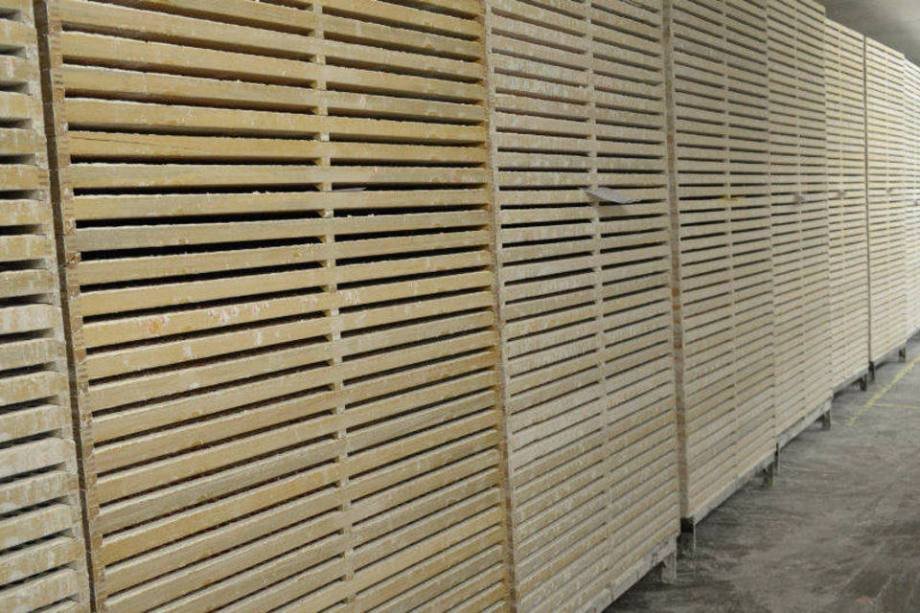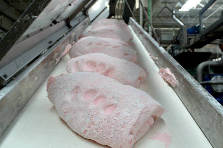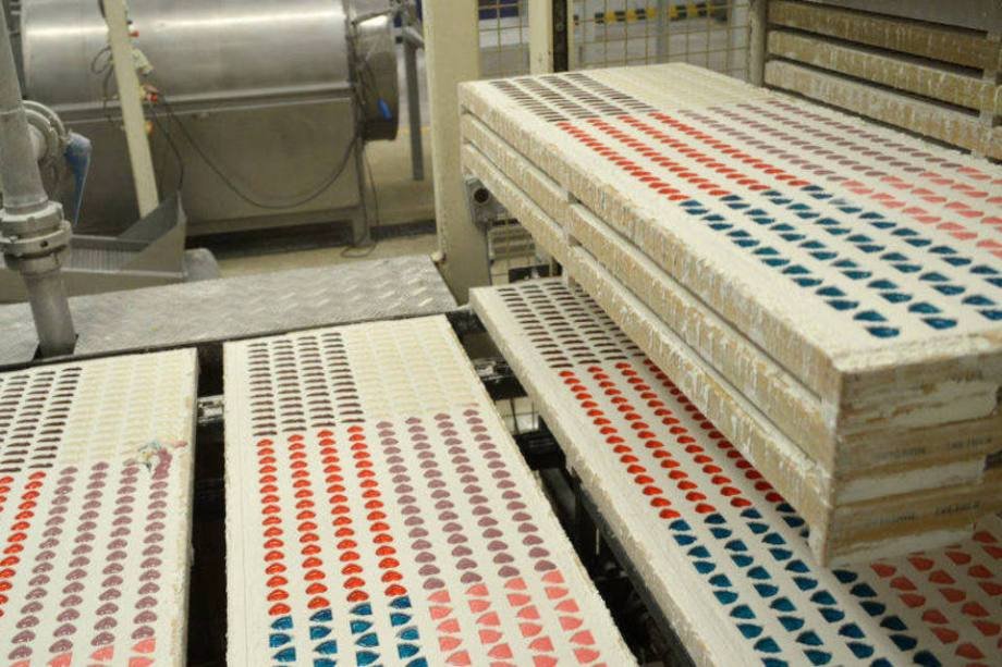 As fôrmas são feitas apenas de amido. O formato é impresso na farinha a partir de pequenos moldes. Ao fim do processo, o amido é reaproveitado para dar origem a novas fôrmas. Como a farinha é extremamente fina, toda a fábrica fica com uma camada branca por cima dos equipamentos.