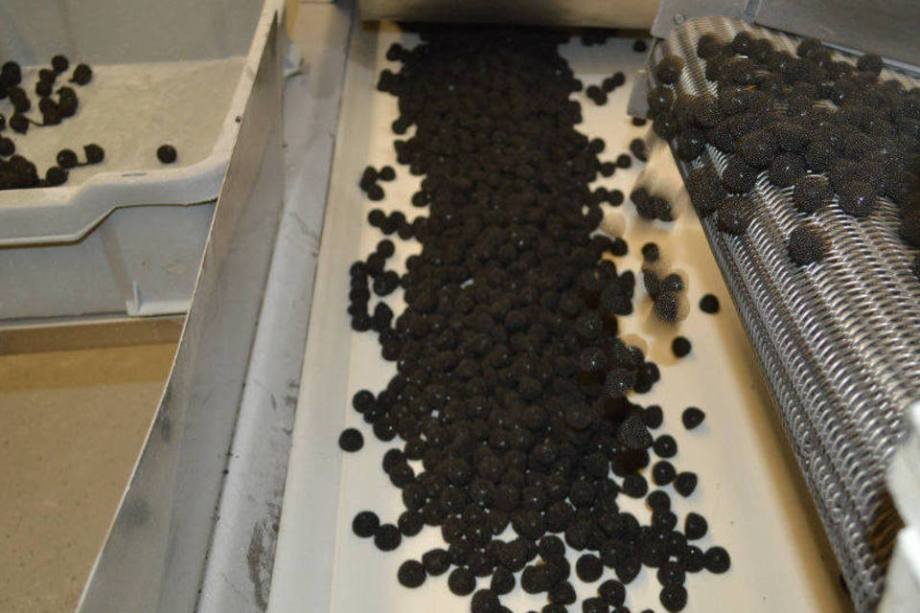 Depois de soltas das bandejas, as balas passam por diferentes tipos de acabamento, a depender do produto final desejado. No caso das balas sem cobertura, como essas, é aplicada apenas uma cera de carnaúba, que serve para impedir que uma grude na outra.