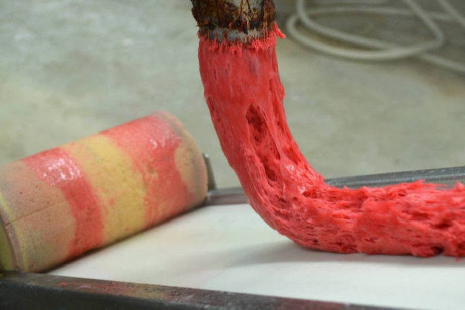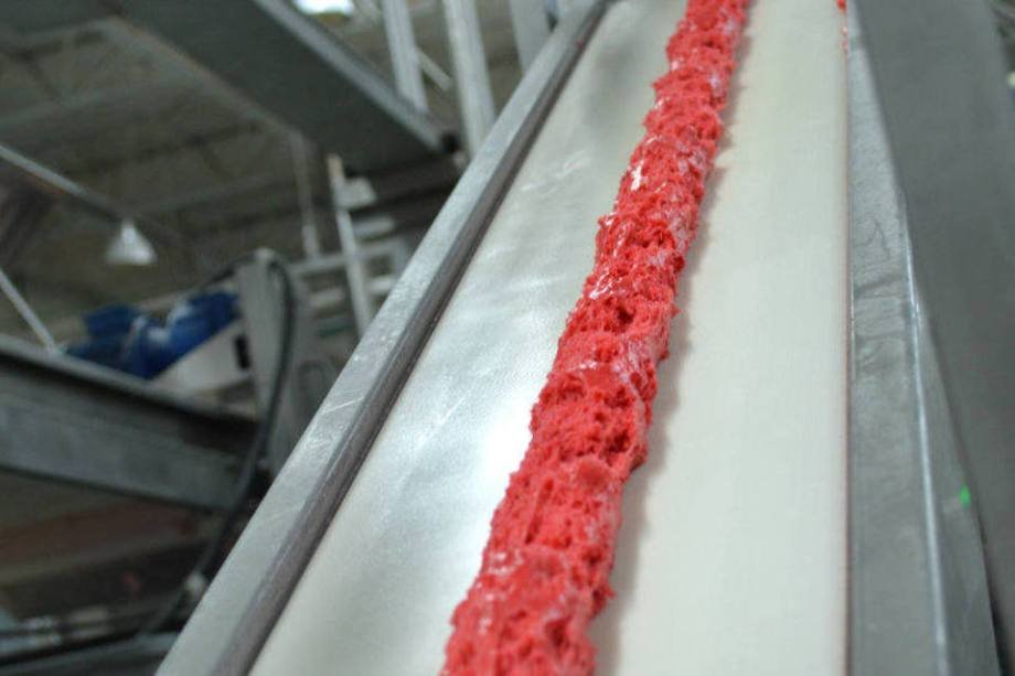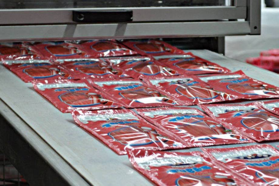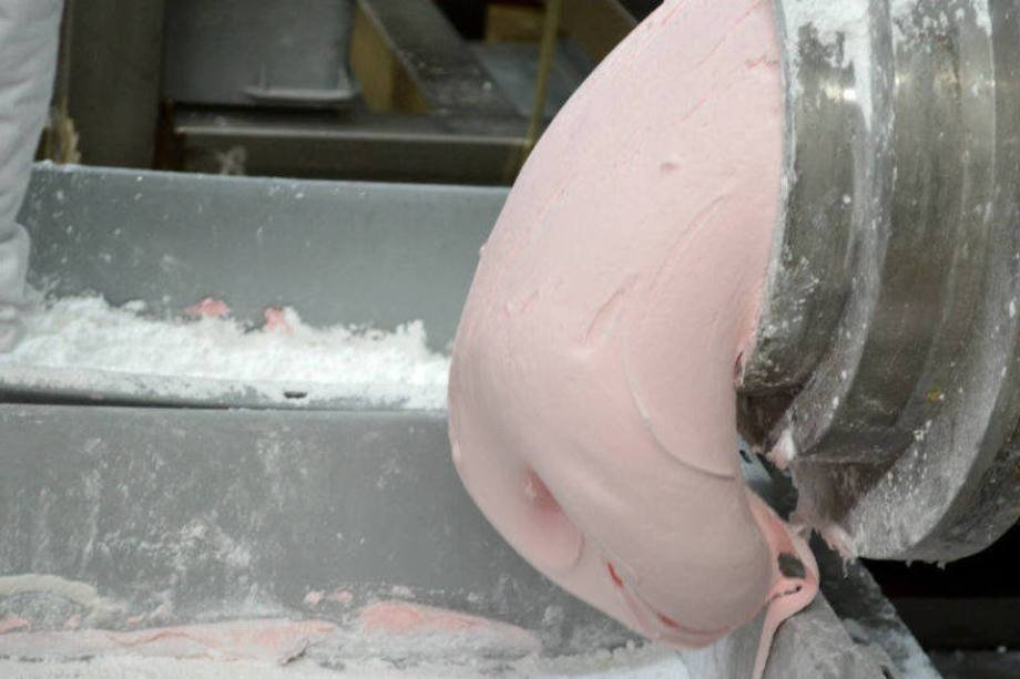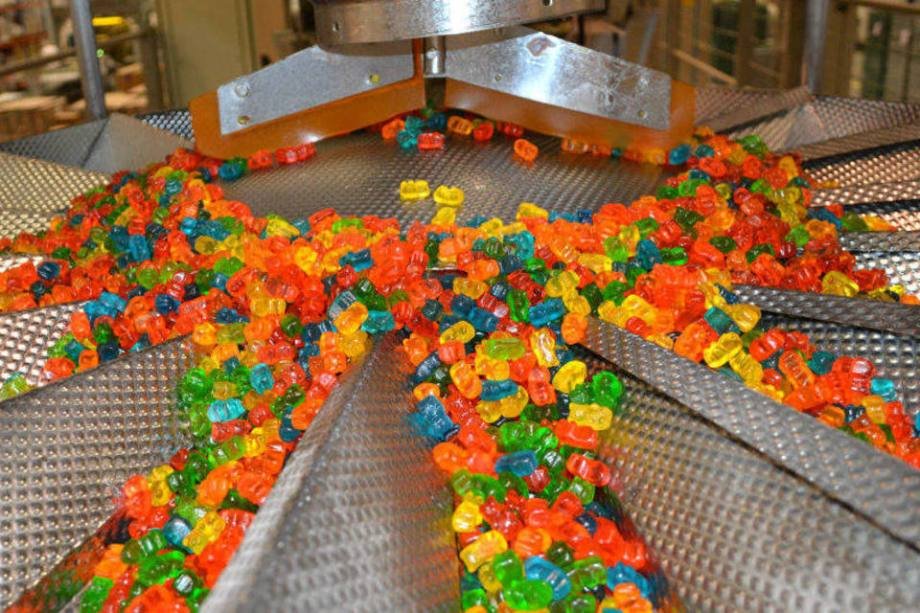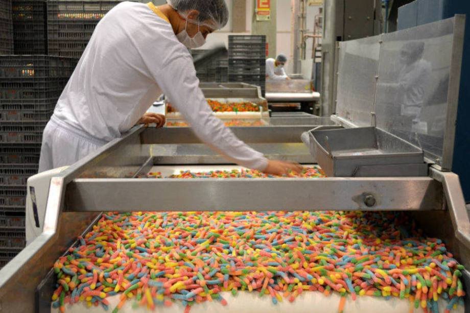 A massa de fora é feita com açúcar, farinha de amido, gelatina e glucose, além do corante e do sabor. Ela é levada até uma máquina, que a unirá à massa interna do doce.